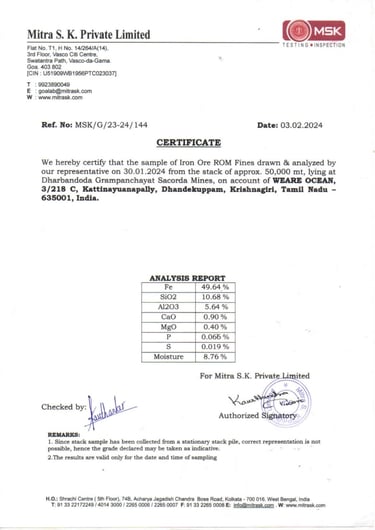 At WAO Steels, ROM ore is received at our dedicated yards near port zones such as Reddi Port and Mormugao. Each batch is weighed, photographed, and tested for: